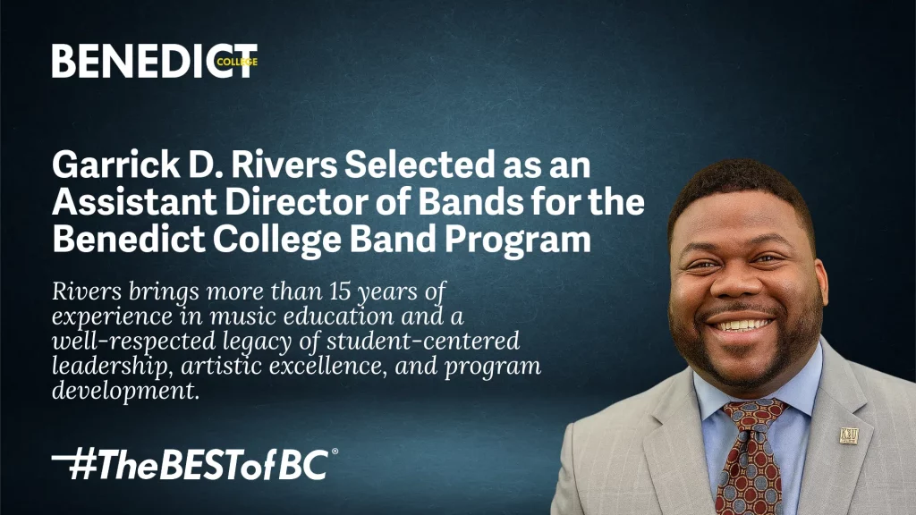 Rivers says, “I am excited to work alongside a talented and dedicated team of educators, musicians, and students who share a passion for the transformative power of music. Together, we will continue to build on the rich traditions of the Benedict College Band Program, while also exploring new creative directions that inspire, challenge, and uplift our community.”